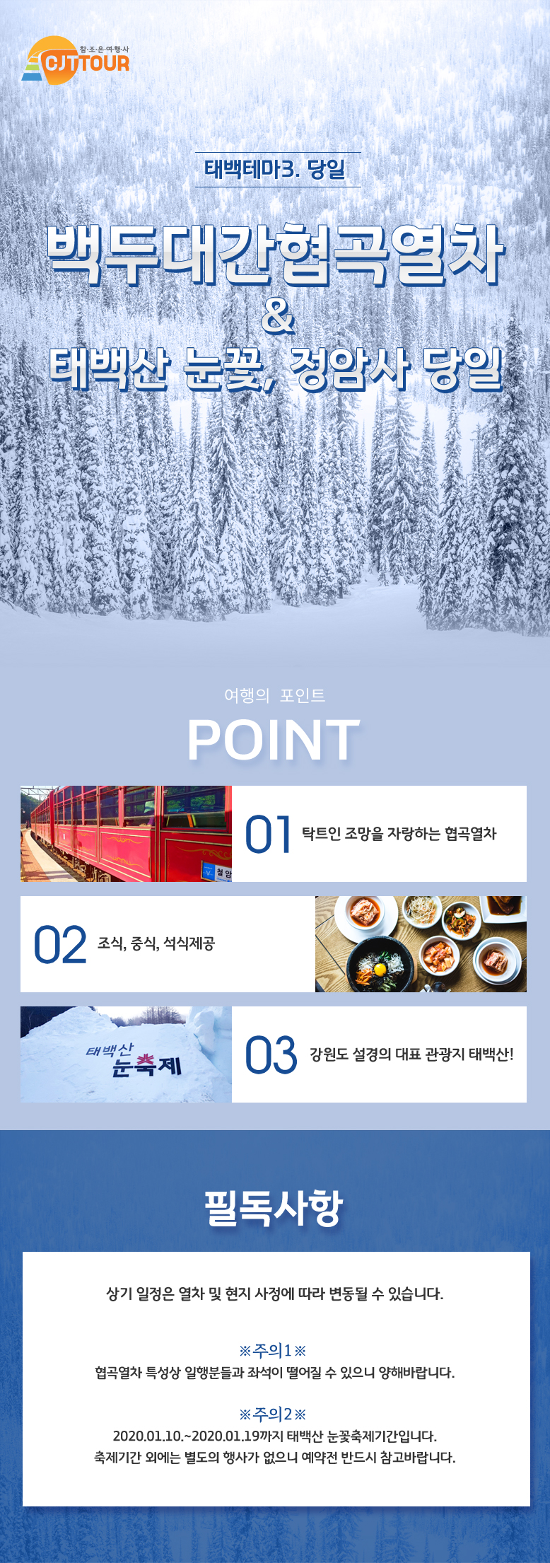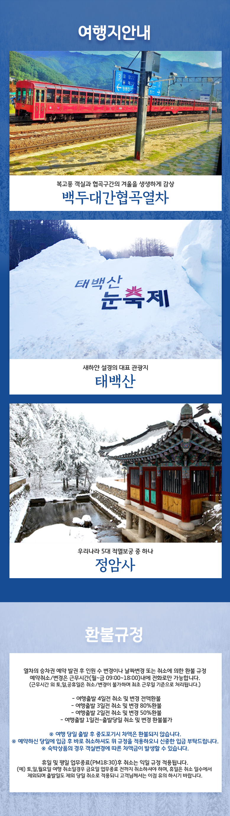 | 여행코스 | 영주역-V-Train백두대간협곡열차 탑승[영주→철암]-태백산국립공원-중식-정암사-석식-철암역 |