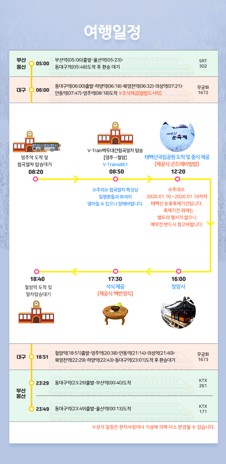 상기 일정은 열차나 천재지변 또는 현지 사정 및 도로교통 상황에 따라 변동될 수 있습니다.