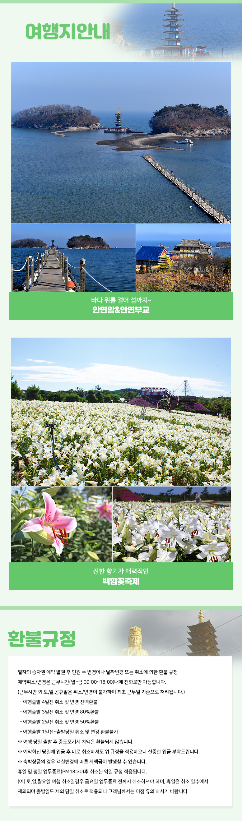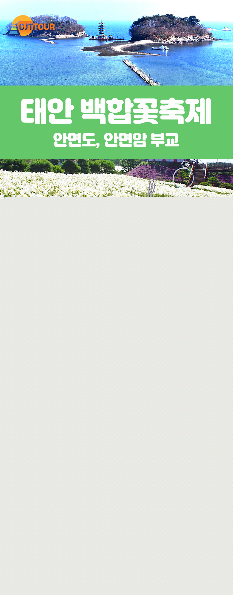 | 여행코스 | 대전역-안면암&안면부교-중식 [제공식:회정식]-백합꽃축제-대전역 |