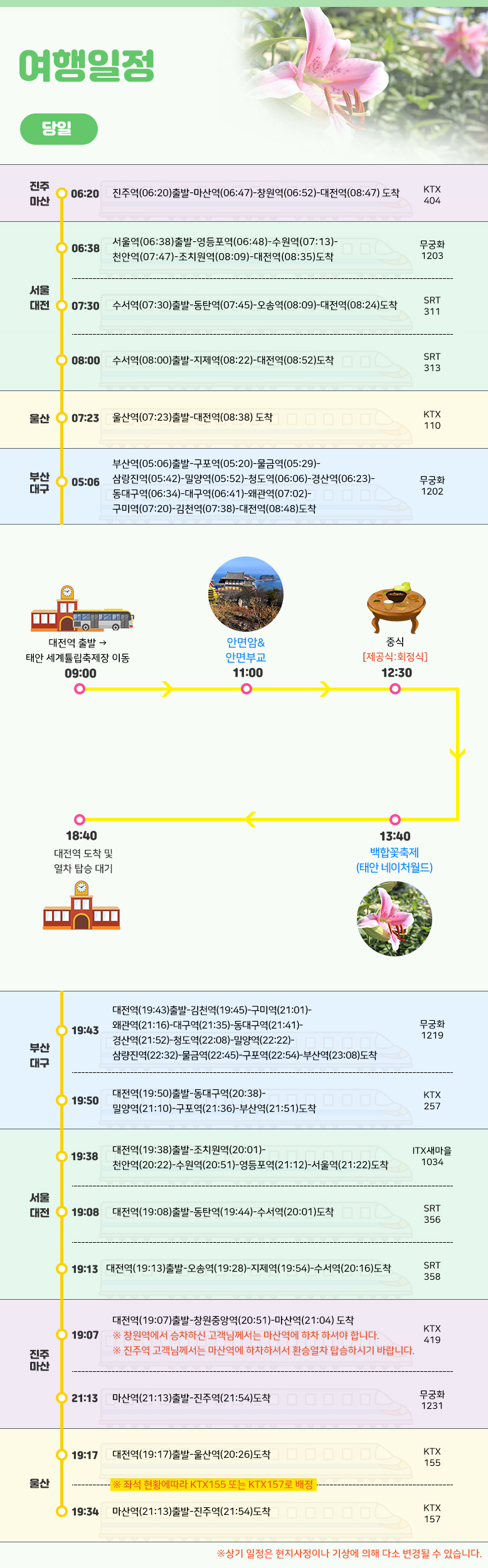 상기 일정은 열차나 천재지변 또는 현지 사정 및 도로교통 상황에 따라 변동될 수 있습니다.
