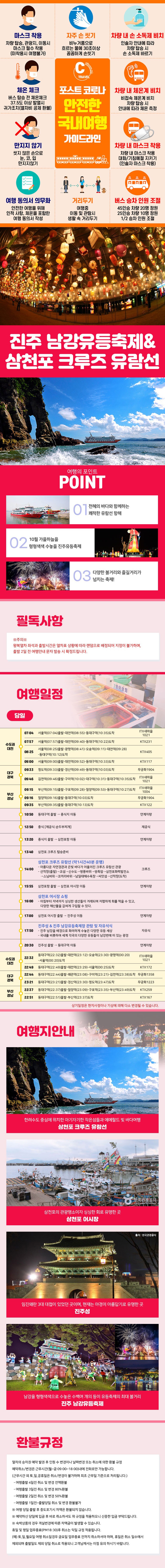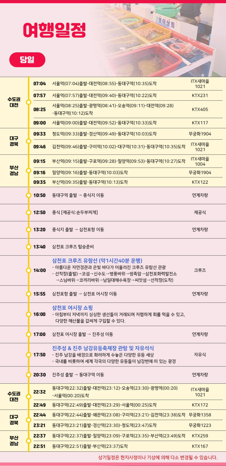 | 여행코스 | 동대구역-삼천포항-삼천포 크루즈-삼천포 어시장-진주성/진주 남강유등축제장-동대구역 |