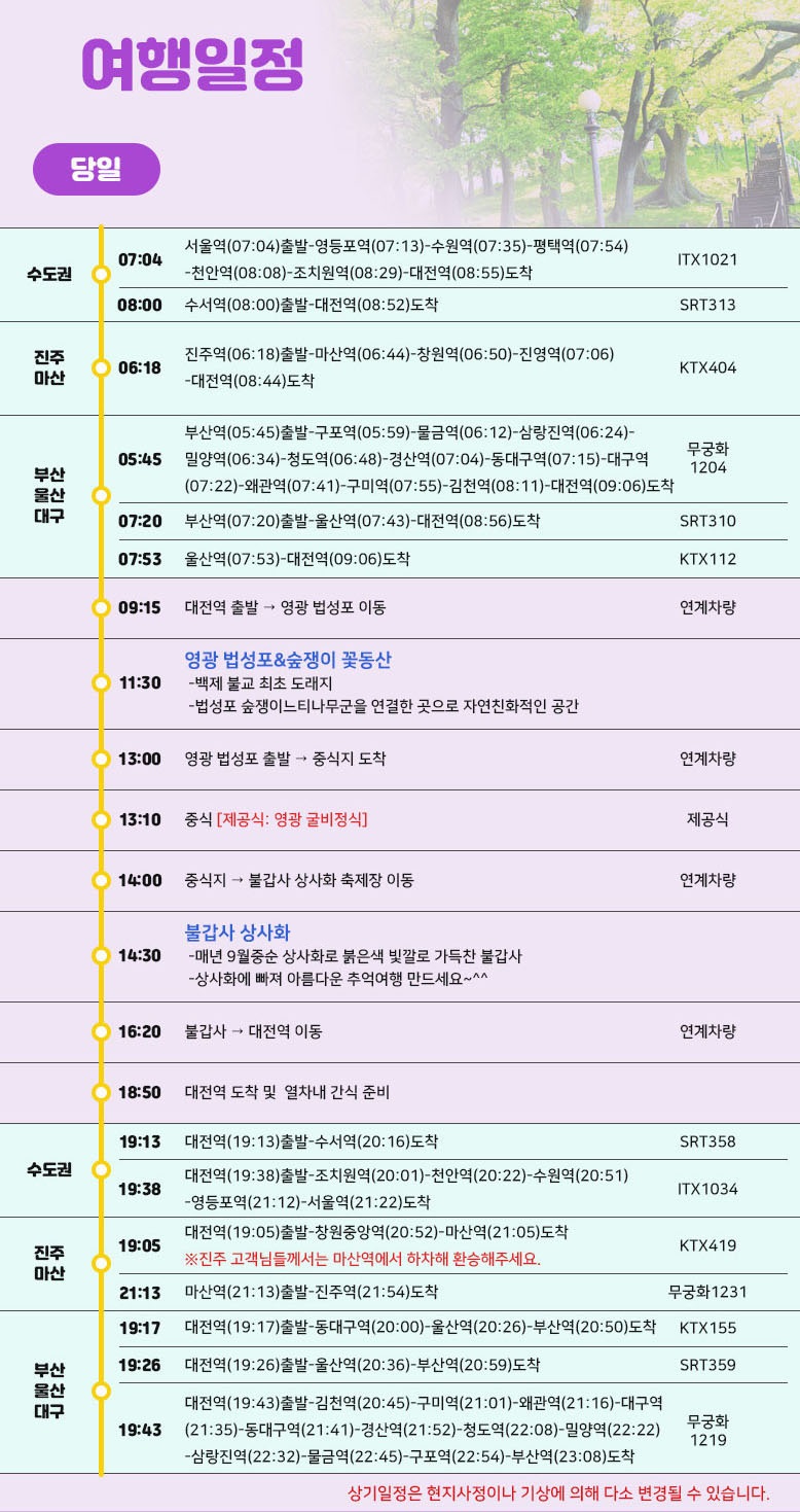 | 여행코스 | 대전역-영광법성포-숲쟁이꽃동산-불갑사 상사화-대전역 |