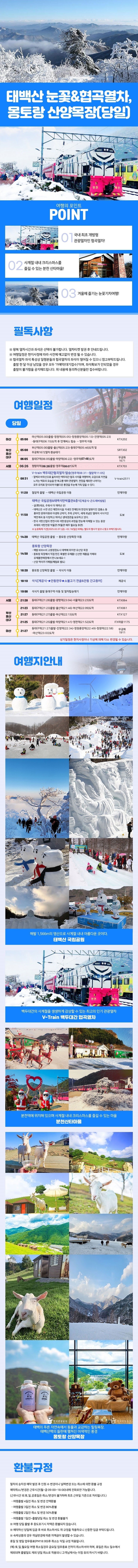 | 여행코스 | 백두대간협곡열차-태백산 국립공원&태백석탄박물관-몽토랑 산양목장-석식-동대구역 |