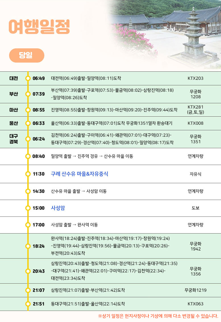 상기 일정은 열차나 천재지변 또는 현지 사정 및 도로교통 상황에 따라 변동될 수 있습니다.