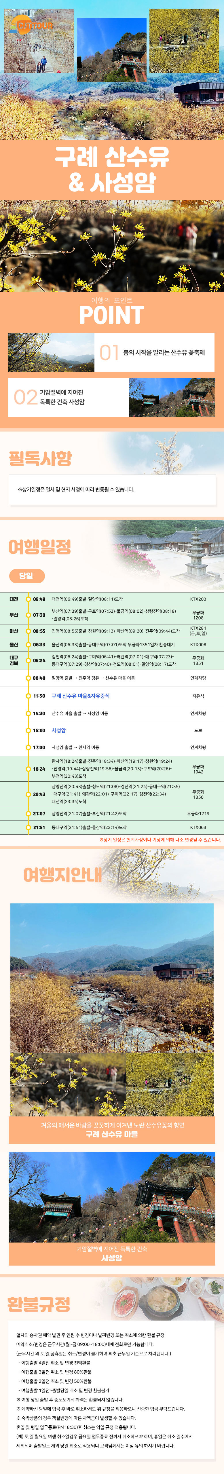 | 여행코스 | 밀양역-진주역-구례 산수유 마을-사성암-완사역 |