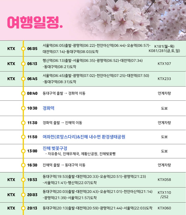 | 여행코스 | 동대구역-경화역(벚꽃 철도길)-여좌천&진해내수면 환경생태공원-진해역-동대구역 |