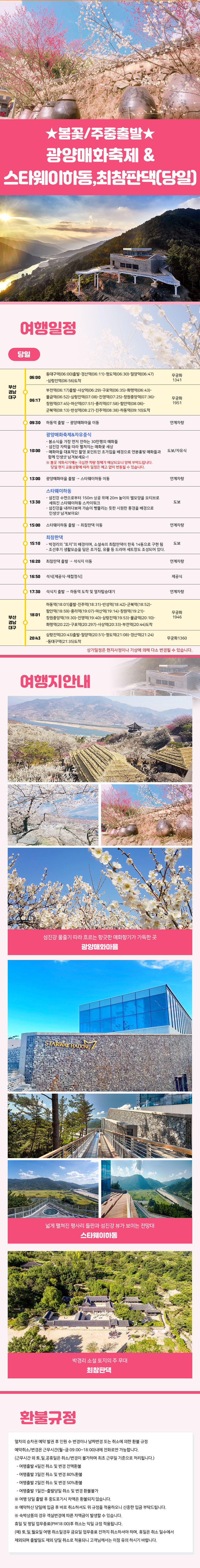 | 여행코스 | 하동역-광양매화축제-스타웨이하동-최참판댁-석식-하동역 |