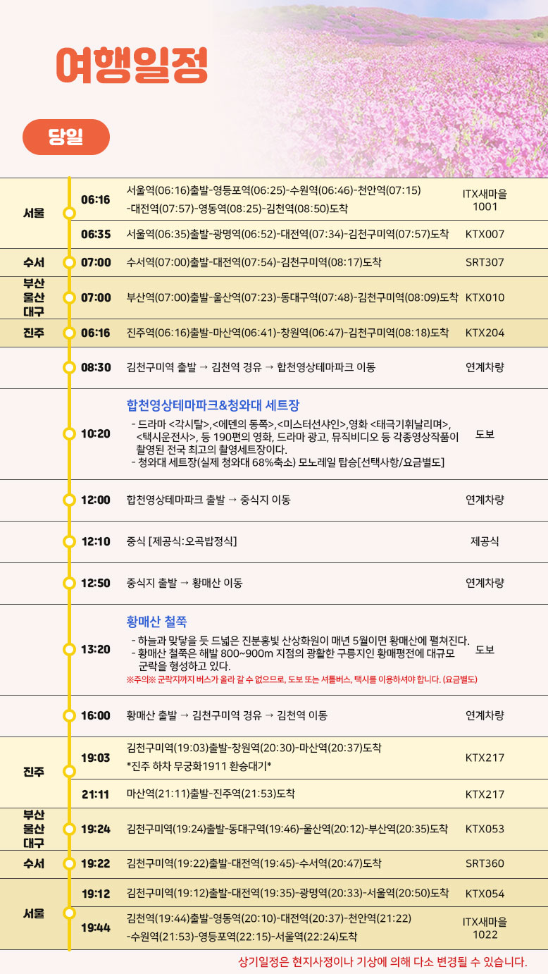 | 여행코스 | 김천구미역-합천영상테마파크&청와대 세트장-황매산 철쭉-김천구미역 |