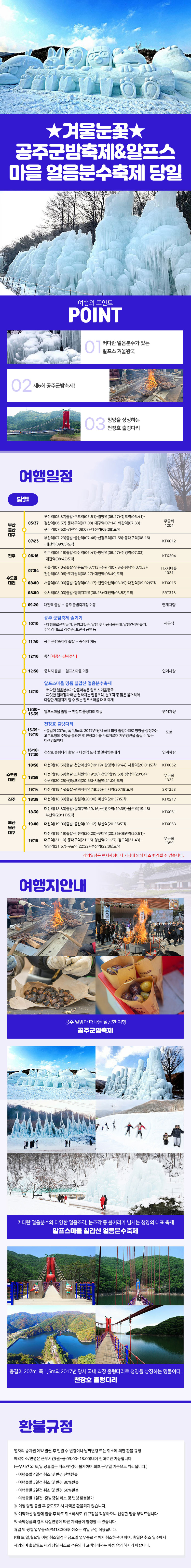 | 여행코스 | 대전역-마곡사-알프스마을 칠갑산 얼음분수축제-천장호출렁다리-대전역 |
