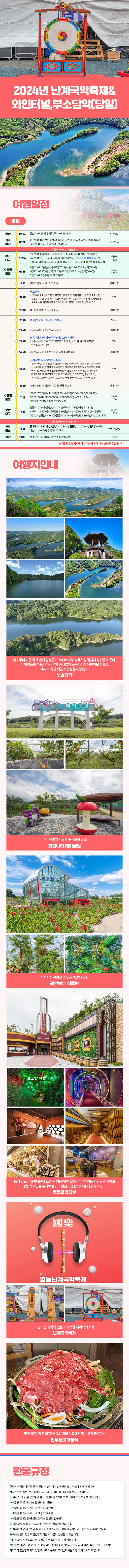 | 여행코스 | 옥천역-부소담악-중식-레인보우 식물원/영동과일나라 테마공원-난계국악축제/영동와인터널-영동역 |