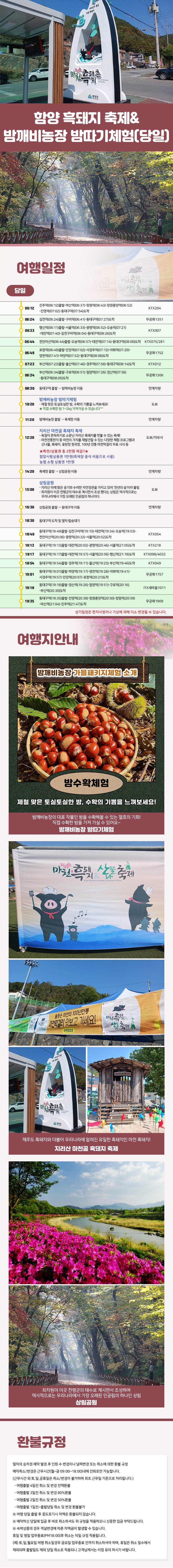 | 여행코스 | 동대구역-밤깨비농장 밤따기체험-지리산 마천골 흑돼지 축제-상림공원-동대구역 |