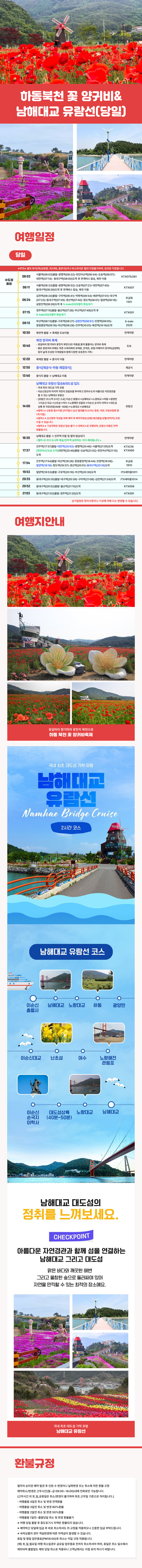 | 여행코스 | 북천역-북천 양귀비축제-중식-남해대교 유람선탑승&대도섬-진주역 |
